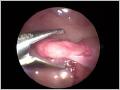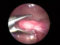 Das Ovar ist identifiziert und wird mit einem Instrument gefasst.